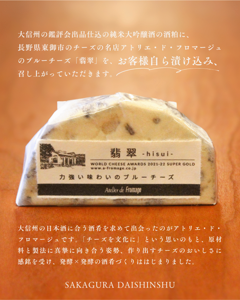 大信州の鑑評会出品仕込の純米大吟醸酒の酒粕に、長野県東御市のチーズの名店アトリエ・ド・フロマージュのブルーチーズ「翡翠」を、お客様自ら漬け込み、召し上がっていただきます。