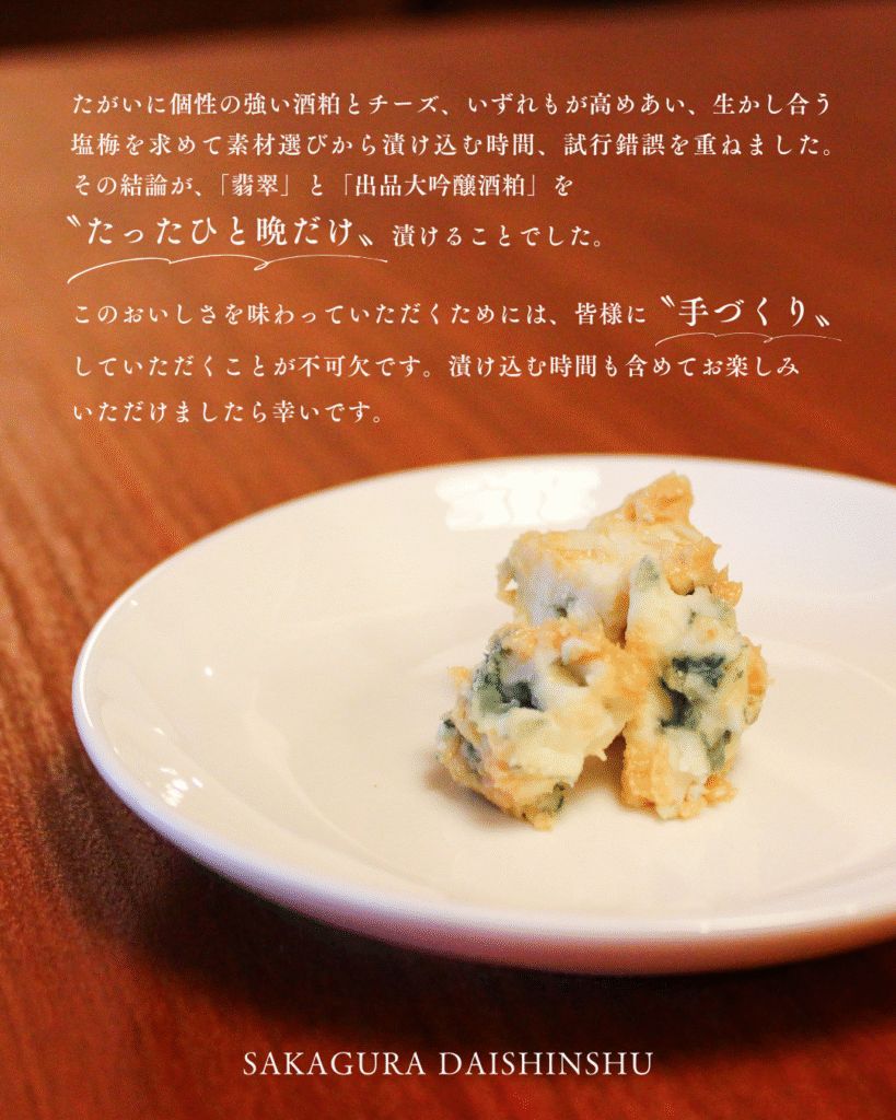 たがいに個性の強い酒粕とチーズ、いずれもが高めあい、生かし合う塩梅を求めて素材選びから漬け込む時間、試行錯誤を重ねました。その結論が、「翡翠」と「出品大吟醸酒粕」を〝たったひと晩だけ〟漬けることでした。